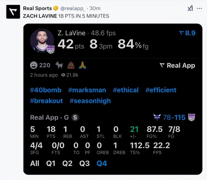 本场比赛,扎克-拉文成为全场焦点。他在上半场表现神勇,9投8中,三分球4投全中,砍下22分、2个篮板和1次助攻。他不仅在进攻端效率惊人,还以超过105%的真实命中率展现了恐怖的得分能力。下半场,拉文继续保持火热状态,末节仅出战5分钟就8投7中,三分球4投4中,独得18分、1个篮板和1次抢断。黄蜂全队末节仅得16分,而拉文一人几乎与之持平。